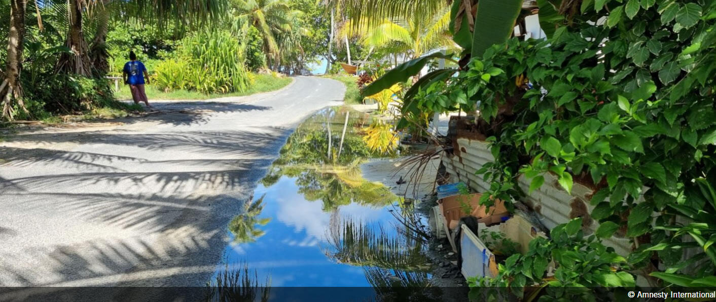 ツバルの首都フナフティに住む女性がアムネスティに語ったところによると、清潔な飲料水の確保は困難になっているという。「私たちはバケツを持って政府庁舎に行き、毎日ろ過水を飲料水として汲んでいます」。